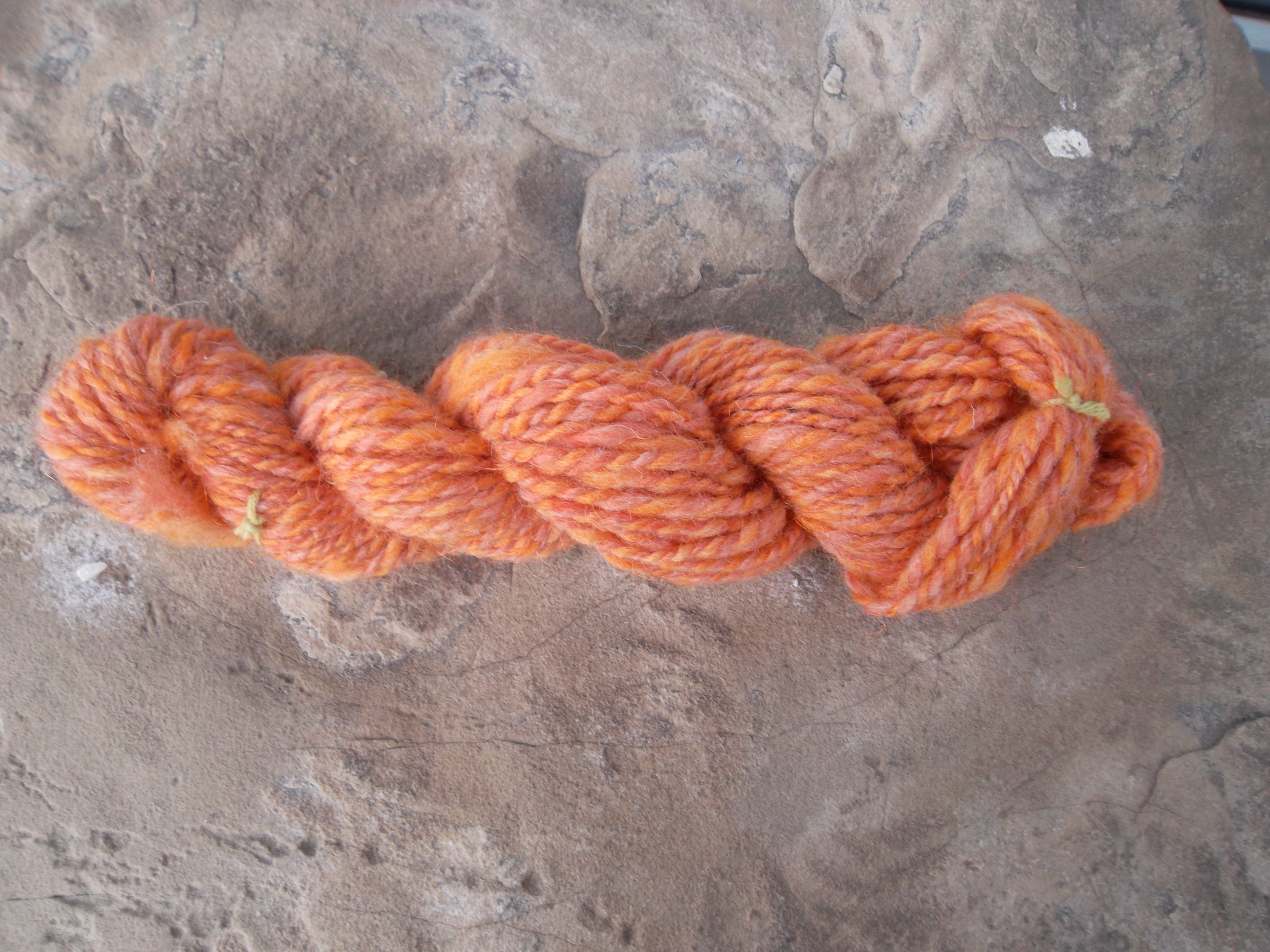 I started spinning up the darker orange and never having used a batt before, I spun it straight from the batt. No dividing or anything, which I found out later would have been the more “standard” way to go. In any case, the single turned out something like this.