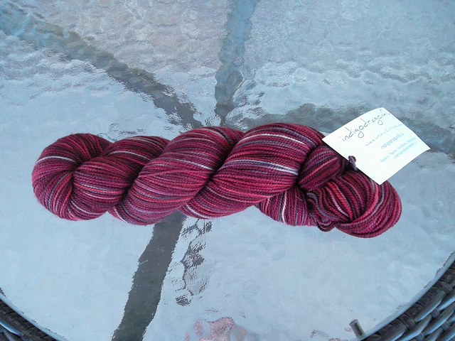 One such yarn came along last year as part of indigodragonfly’s World Wide Knit In Public Day Auction, to benefit The Canadian Breast Cancer Support Fund. The idea was simple. One could bid on the rights to name one of several one-of-a-kind colourways, and decide what colours were used to dye that yarn. Then others could bid on the finished skeins. There were only four skeins of each colourway made, so bidding on some of them turned out to be pretty fierce.