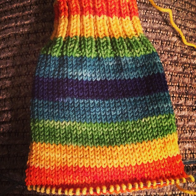 Last night I decided to cast on a new project. None of the dozen or so I had on needles were calling to me at all, and I wanted something bright and cheerful, darn it!! So I hauled out my bin of wound yarn and saw my skeins of Turtlepurl Striped Turtle Toes, in “Polly Wanna Cracker?”. Orange, yellow, green and blue. Perfect. Just the colours to lift my spirits.